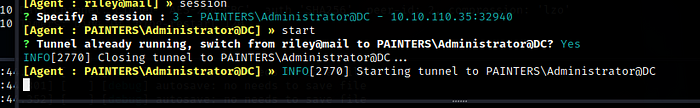 실행 중인 ligolo 인터페이스로 돌아가서 session을 입력하고 새 터널이 있는 시스템을 선택하고 start를 입력합니다. 터널을 전환하려면 예를 선택하기만 하면 됩니다.