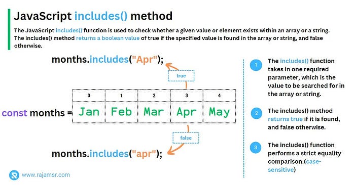 이 예제에서는 배열 months에 문자열 'Apr'이 포함되어 있는지 확인합니다. includes() 메서드는 배열에 'Apr' 값이 포함되어 있으므로 true를 반환합니다.