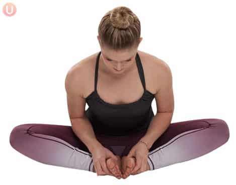 1) 앉은 자세에서 다리를 최대한 옆으로 벌리고 발가락을 위로 향하게 합니다.