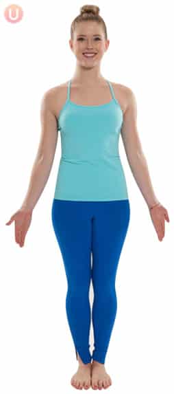 1) 발과 다리를 모으고 서서 숨을 들이쉴 때 양팔을 머리 위로 곧게 뻗습니다.